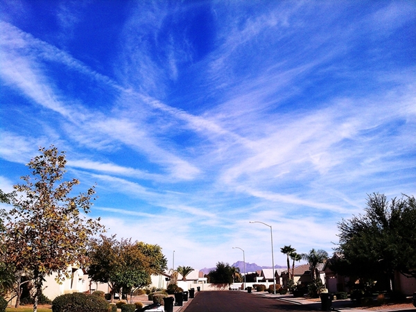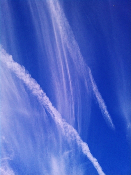 I always wonder if people who look up into the sky every day and observe clouds that are “unusual looking”, realize that most of the time they are produced by chemtrails. I happened to be outside enjoying the warm weather the other day where I live, in the Desierto Sonorense, when I looked up – like I always do – and noticed these clouds with their parent chemtrails: