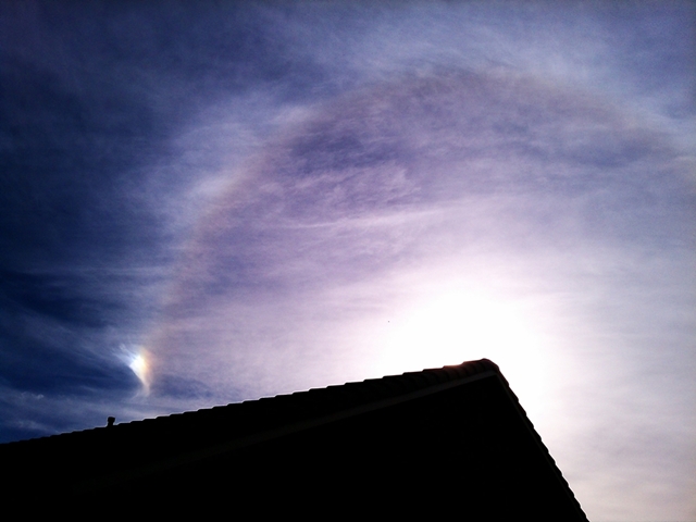 As I was observing these cloud forms, another atmospheric phenomenon started taking shape, something that is rare but not impossible to observe. What I witnessed was a 22 Degree Halo around the sun, a Sundog and a partial Parhelic Circle. These are significant because they are forming more frequently due to the chemtrail induced high cirrus clouds in the atmosphere. I have never witnessed a Parhelic Circle before and I have been observing the sky since I was very young. (I was interested in astronomy and meteorology at an early age).