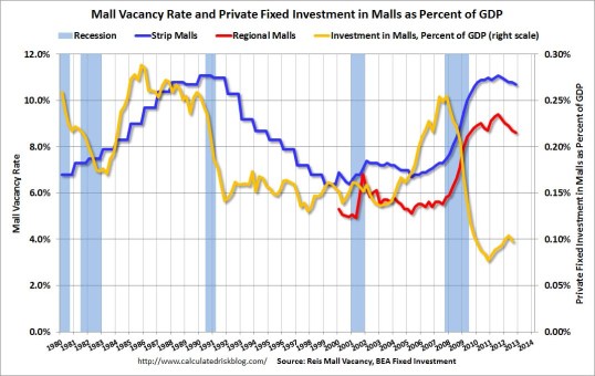 In an economic system that rewarded good choices and punished those who took ridiculous undue risks and lost, real estate developers, mall owners, and office landlords would be going bankrupt in large numbers and loan losses for Wall Street Too Stupid to Succeed banks would be in the billions. Developers took out loans in the mid-2000’s which were due to be refinanced in 2012. The property is worth 35% less and the rental income with a 20% vacancy rate isn’t enough to cover the interest payments on the loan. The borrower would have no option but to come up with 35% more cash and accept a higher interest rate because the risk of default had risen, or default. Instead, the lenders have pretended the value of the property hasn’t declined and they’ve extended the term of the loan at a lower interest rate. This was done on the instructions of the Federal Reserve, their regulator. The plan is dependent on an improvement in the office and retail markets. It seems the best laid plans of corrupt sycophant central bankers are going to fail.