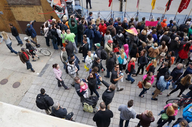 Image: Event staff and contractors both above and below the bleachers begin tearing up the skirting and appear to be looking for something or retrieving something while casualties are still being treated and evacuated across the street. (click to enlarge)