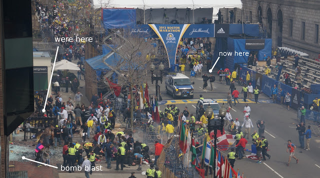 Image: An already widely distributed photo showing the contractor-types on the bottom left, just left of where the bomb was placed and detonated. The men are wearing matching, unmarked uniforms, large black bags, and appear to be waiting, separately, and “behind” the rest of the crowd. In the upper left corner, a wooden structure forming one half of a temporary photography “bridge” over the finish line can be seen and serves as a useful reference when establishing the contractor-types’ position in other photos.