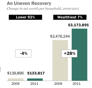 “All over the world people borrowed vast sums of money they could never repay. The honest toting up, and taking, of the losses is being delayed. There’s a reason for this. The bad debts are owed, largely, to big banks. The big banks (even bigger than they were at the start of this crisis) and the people who own them enjoy a wildly disproportionate amount of political influence. And so, even now, five years into this mess, we remain at the mercy of the failed financial institutions that sit at the center of our capitalism. Geithner & Bernanke, along with their European counterparts, are doing everything in their power to prevent banks from failing. But the effect of this new financial order is bizarre: capitalism for everyone but the capitalists. Ordinary workers remain fully exposed to the increasingly harsh collisions in the marketplace while the highest paid financial elites ride protected by a passenger airbag.” – Michael Lewis – Boomerang