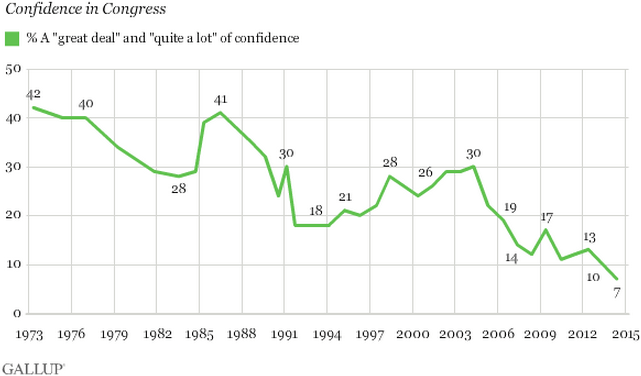 American’s confidence in their elected officials has fallen to a historic new low in Gallup’s annual 2014 confidence in institutions survey. Only a scant 7% of citizens had a “great deal” or “quite a lot” of confidence in Congress, down from the previous record low of 10% logged in last year’s poll.