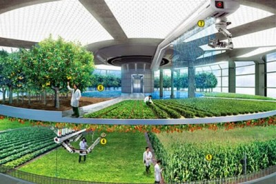 | Image: Future agriculture taking place within an enclosed, protected, and optimized environment allows food production to continue no matter what the climate outside is doing. |