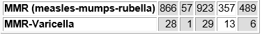 For the MMR-Varicella vaccine: 28 injuries, 1 death, 13 compensated, and 6 dismissed.