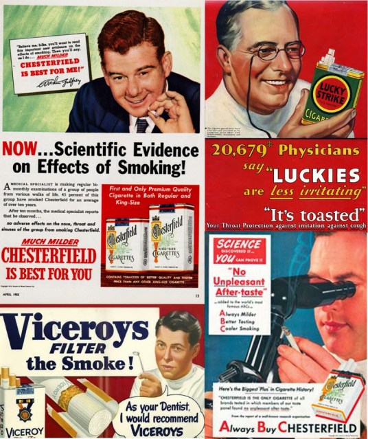 | Images: The “science” of smoking. Images collected by the New York Times for their article, “When Doctors, and Even Santa, Endorsed Tobacco” depict “scientific studies” assuring consumers of the safety, even benefits of smoking cigarettes commonsense told everyone else were literally killing people. Those today who think they are ahead of everyone else by parroting “scientific studies” regarding big-ag’s GMOs, big-pharma’s vaccines, and big-oil and bankers’ climate change racket are ahead of nothing. They are being duped by an old trick practiced shamelessly for at least 100 years. |