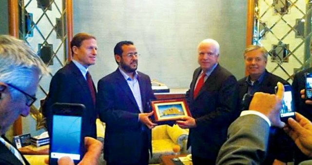 In essence then, the United States and its NATO partners knowingly and willfully handed the nation of Libya and its people over to Al Qaeda. Despite Belhaj’s documented terrorist past and present, US politicians would meet with him, showering upon him accolades, praise, and continued political and military support. Among these politicians were US Senators John McCain and Lindsey Graham who met and literally shook Belhaj’s hand while standing upon the ruins of Libya.
