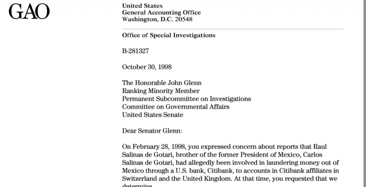 In October 1998, The Swiss government confirmed that the brother of the former Mexican president had deposited some 100 million in drug money in Swiss banks: