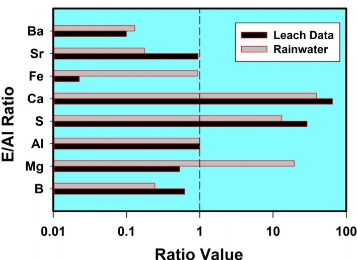 One limitation in the use of commercial laboratories is in their limits of detection for some elements. Note from Figure 2 that the experimental coal fly ash leachate element ratios span six orders of magnitude. When academic research laboratories, with their high sensitivity capabilities, hopefully repeat the post-spray rainwater measurements, additional “matched pairs” for other elements will doubtlessly be added to the coal fly ash “fingerprint” presented in Figure 3.