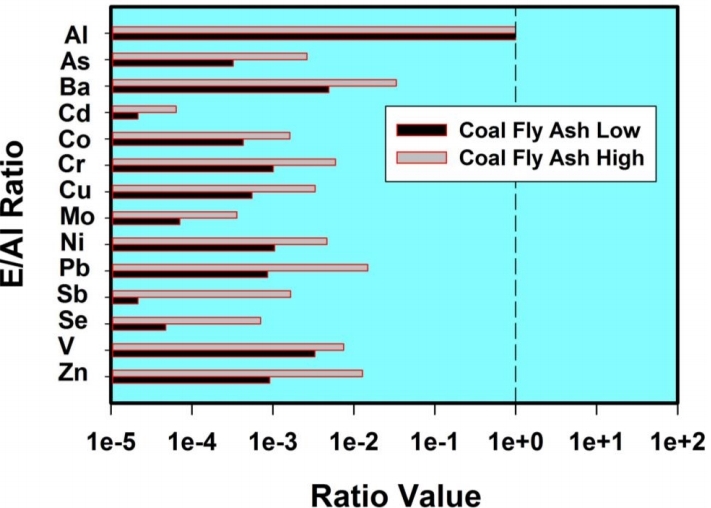 Figure 4 shows concentrations of 14 chemical elements, normalized to aluminum, measured in the Los Angeles HEPA air filter dust for comparison with corresponding average element ratios for un-leached coal fly ash data (Table 1) from [10].