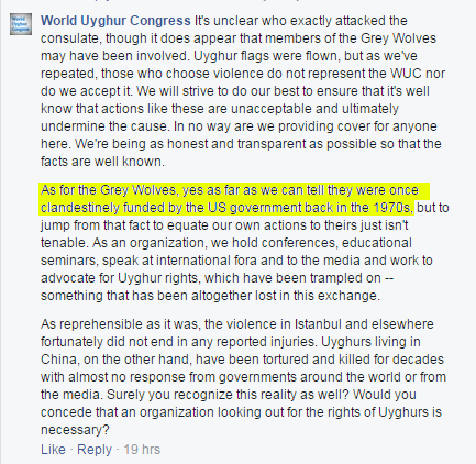 WUC admits that violence broke out among the mobs it was leading in Ankara but denied any affiliations with the protesters in Istanbul who attacked the consulate and destroyed it on the same day, in the same country, over the same alleged grievances. WUC itself suggested it was the work of the “Grey Wolves,” an organization they admit was “clandestinely funded by the US government.”