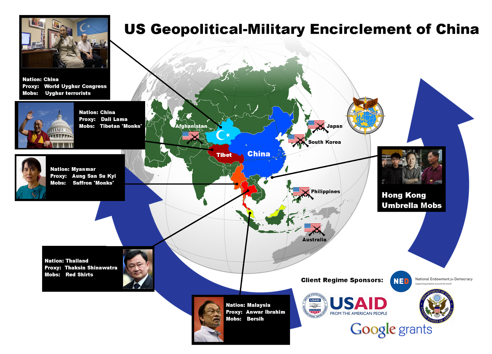 In addition they have attempted to encircle China with military bases from South Korea and Japan to as far south as Darwin, Australia, and as far west as Afghanistan, all while attempting to carve off Chinese territory in the Xinjiang and Tibet regions, destabilize Hong Kong, and stitching together Southeast Asia into an supranational bloc with which to isolate and threaten China with economically and militarily. Political subversion underwritten by the US State Department is ongoing in Xinjiang through the use of Uyghur terrorists, Tibet via the Dali Lama, Myanmar via Aung San Suu Kyi and her “Saffron monks,” Thailand through the Shinawatra family and their ultra-violent “red shirt” mobs, Malaysia via Anwar Ibrahim and his Bersih street movement, and Hong Kong via the so-called “Umbrella revolution.”