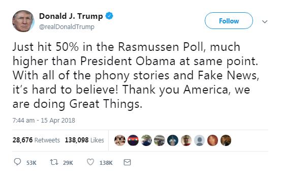 The study looked at every one of the 1,065 network evening news stories about Trump and his administration during the first four months of 2018. Total negative news time devoted to Trump: 1,774 minutes, or about one-third of all evening news airtime. That’s pretty much the definition of a circle jerk.