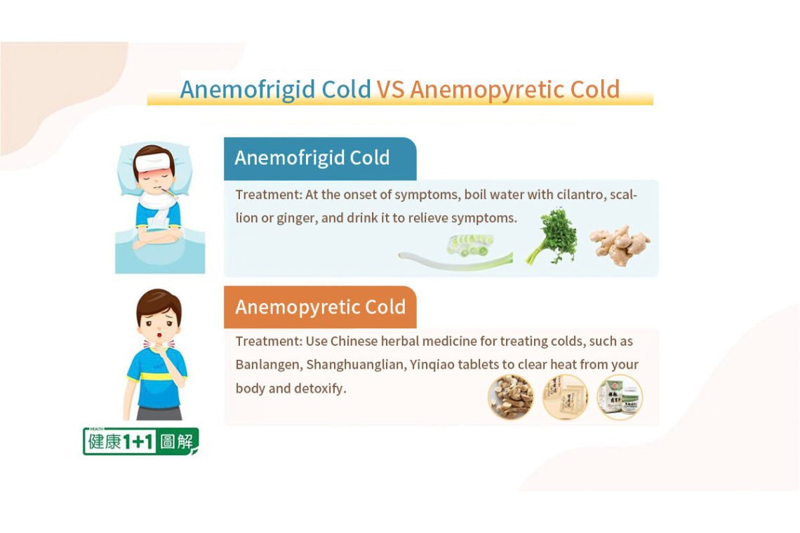 In TCM, the classification of “colds” is not the same as in Western medicine. TCM divides colds into two types according to the symptoms: anemofrigid (wind-cold) cold and anemopyretic (wind-heat) cold.