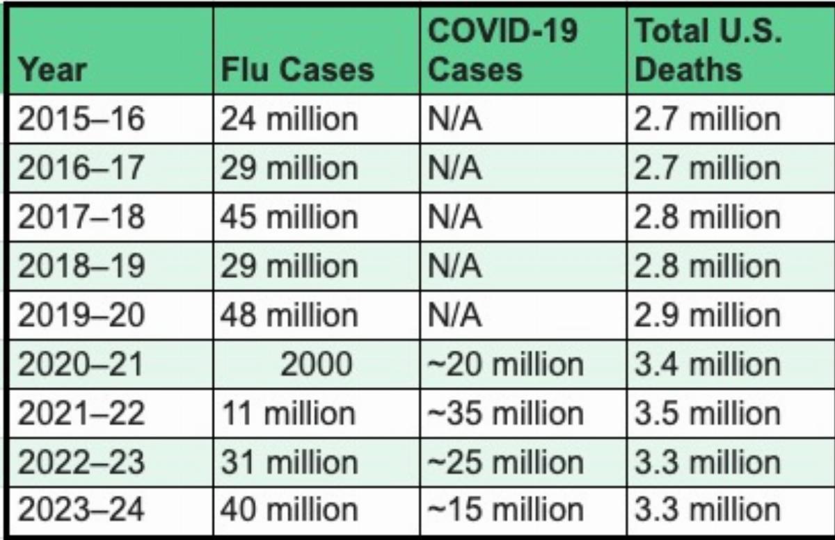 Here is a year-by-year comparison of flu and COVID-19 cases in the U.S., alongside total recorded deaths from all causes: